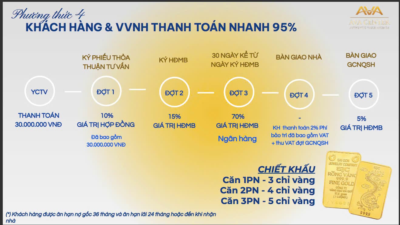 Giá bán căn hộ Ava Center bắt đầu từ 36 triệu đồng/m², phù hợp cho cả nhu cầu an cư lẫn đầu tư. Khách hàng chỉ cần trả trước 10%, thanh toán 30% đến khi nhận nhà, kết hợp hỗ trợ vay ngân hàng 70% với lãi suất 0% và ân hạn gốc, giúp việc sở hữu dễ dàng hơn.