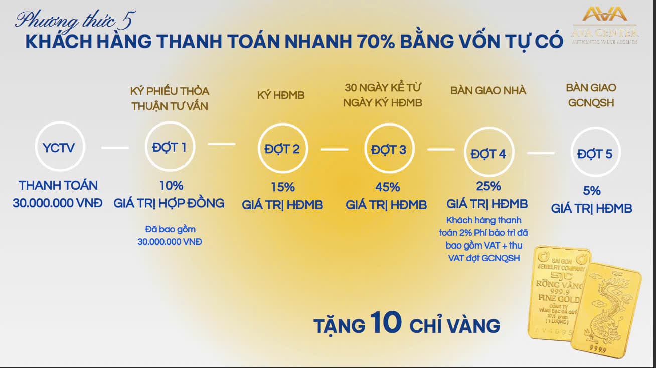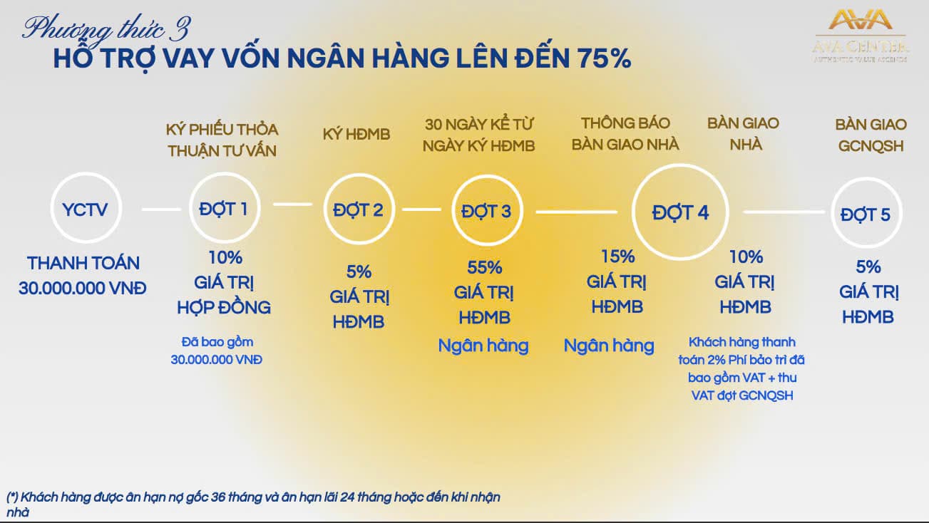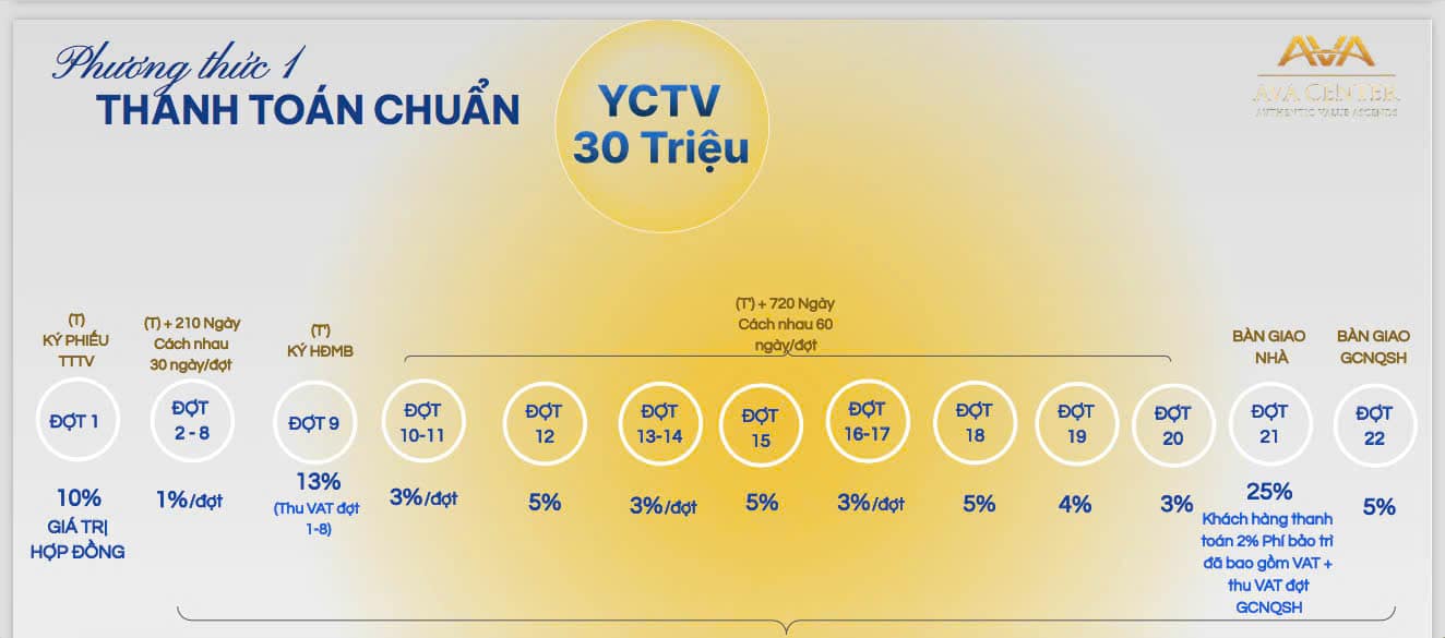 Giá bán căn hộ Ava Center bắt đầu từ 36 triệu đồng/m², phù hợp cho cả nhu cầu an cư lẫn đầu tư. Khách hàng chỉ cần trả trước 10%, thanh toán 30% đến khi nhận nhà, kết hợp hỗ trợ vay ngân hàng 70% với lãi suất 0% và ân hạn gốc, giúp việc sở hữu dễ dàng hơn.