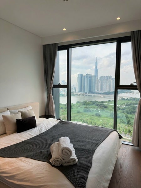 Tầng trung mang lại góc nhìn cân bằng, không quá thấp để ồn và không quá cao gây bất tiện cho gia đình có trẻ nhỏ. View sông và Landmark 81 mở rộng, tạo giá trị cảnh quan hiếm trong phân khúc.