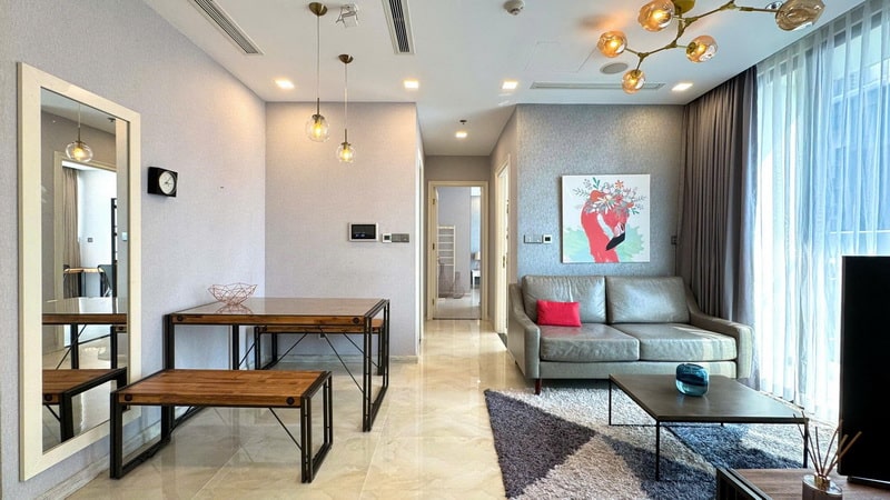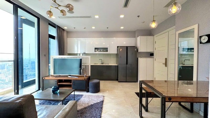 Toàn bộ căn hộ được trang bị nội thất đồng bộ, hiện đại, phù hợp khách thuê cần sự tiện nghi. Không gian phòng khách, bếp và phòng ngủ đều được bố trí chăm chút, đảm bảo sử dụng lâu dài mà không cần đầu tư thêm.