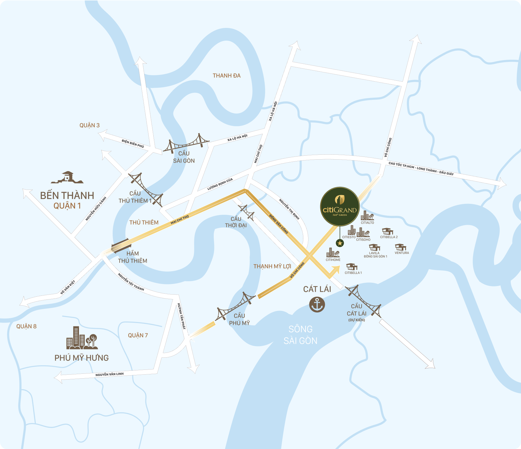 - 10 phút đến Phú Mỹ Hưng (Quận 7) qua Đồng Văn Cống → Võ Chí Công → Cầu Phú Mỹ.