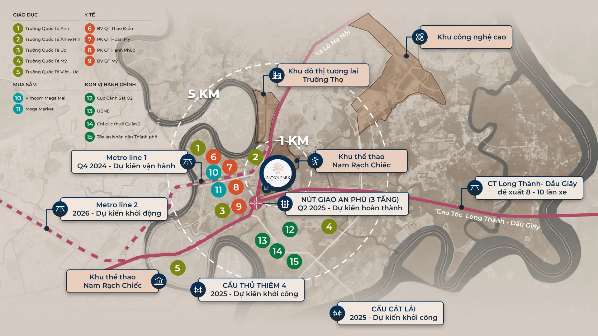 - 500m → Nút giao An Phú, kết nối cao tốc Long Thành – Dầu Giây