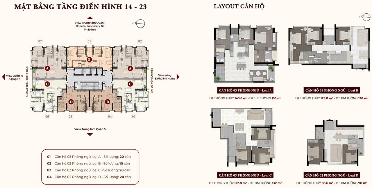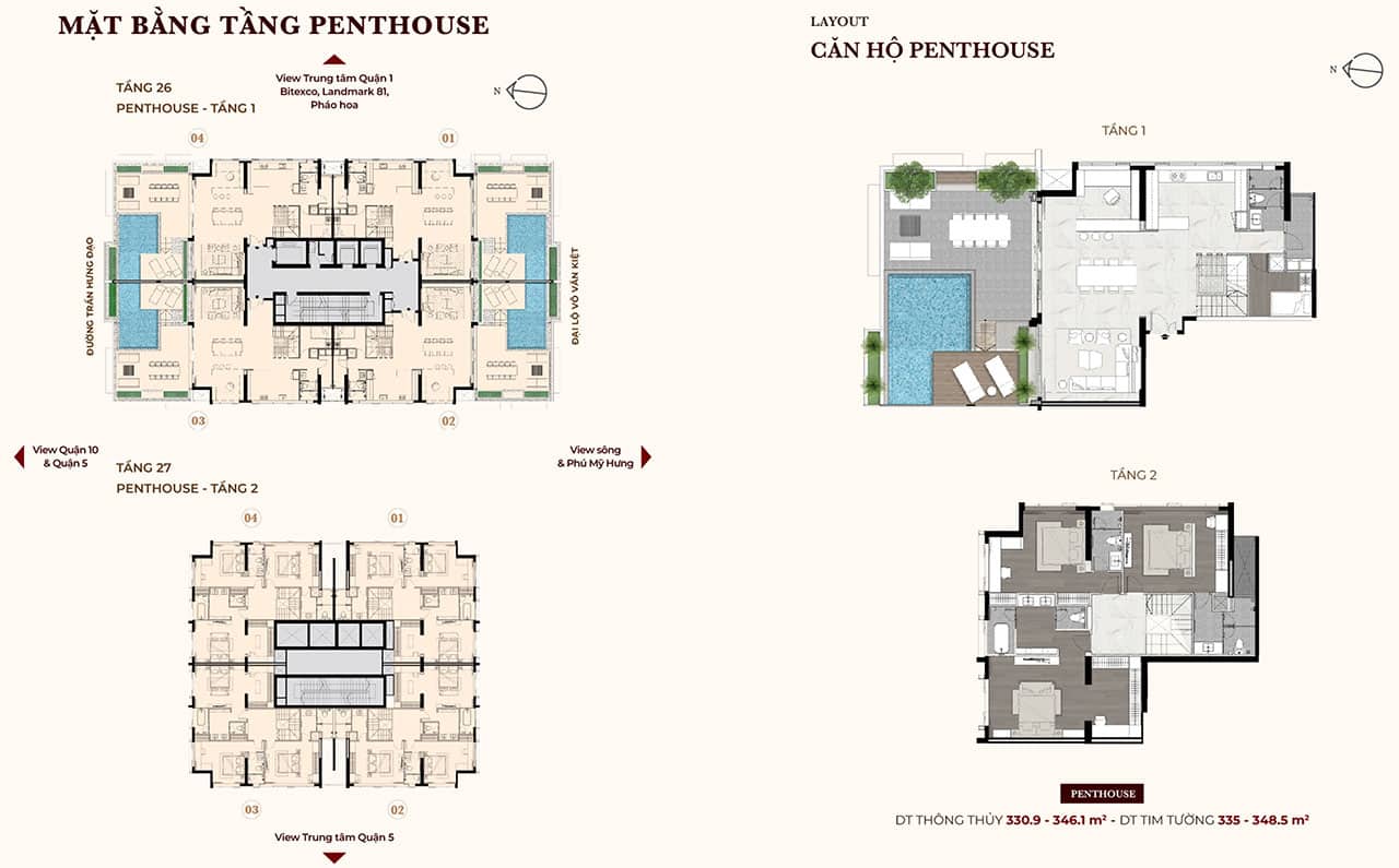 - Tầng 26 – 27: Penthouse dạng Duplex (4 căn), hướng đến giới thượng lưu với tầm nhìn toàn cảnh trung tâm Sài Gòn.
