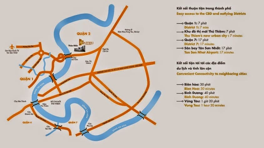 - 10 phút đến Quận 1 thông qua Đại lộ Mai Chí Thọ và hầm Thủ Thiêm.