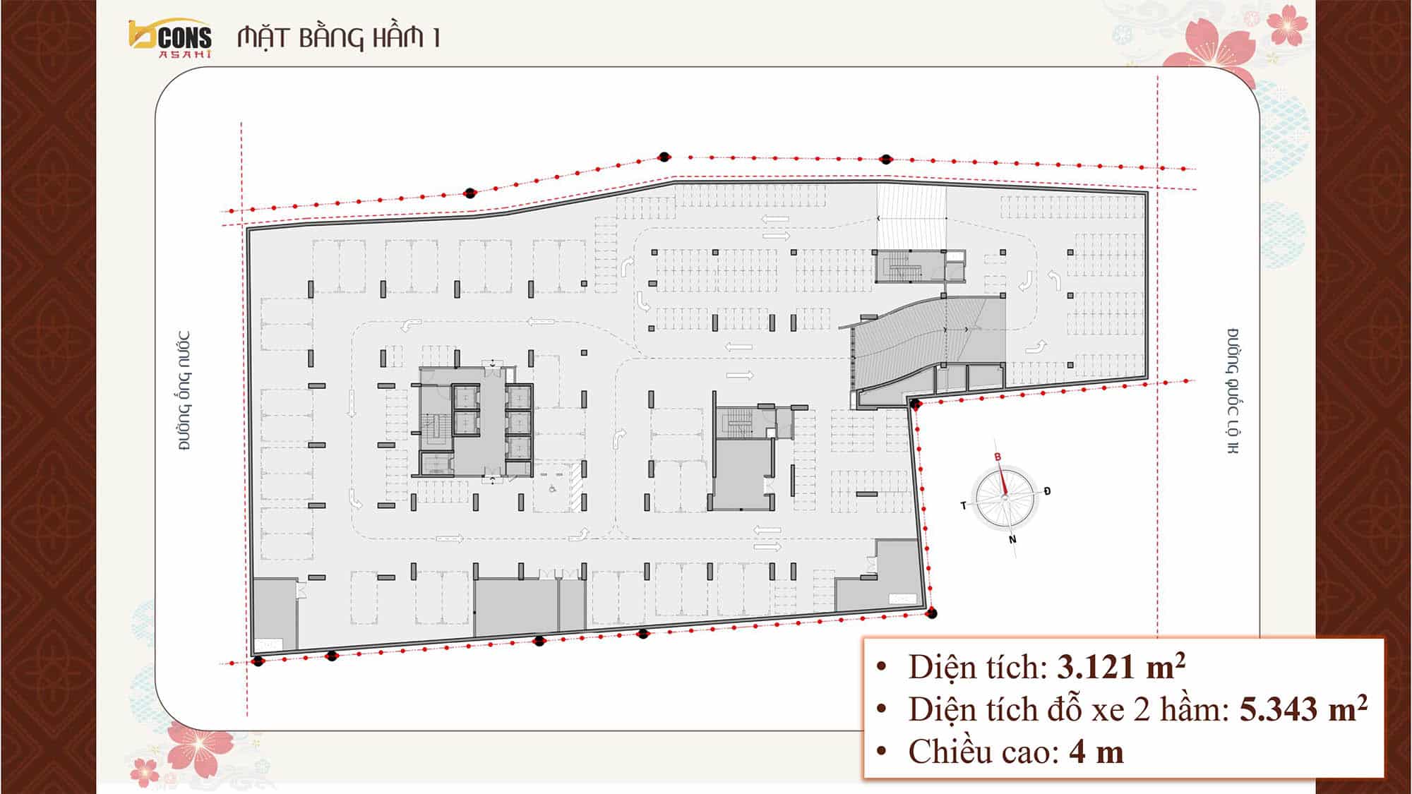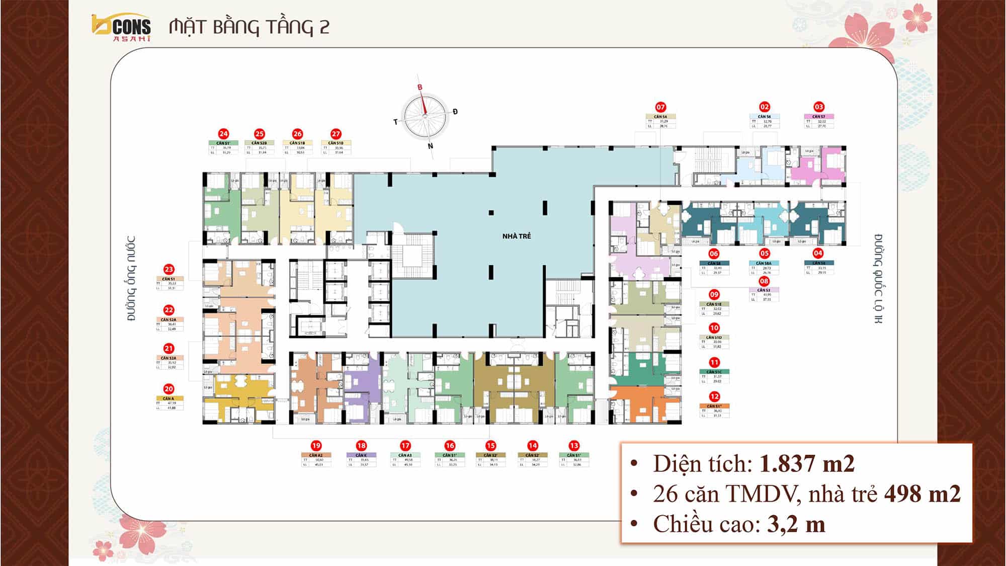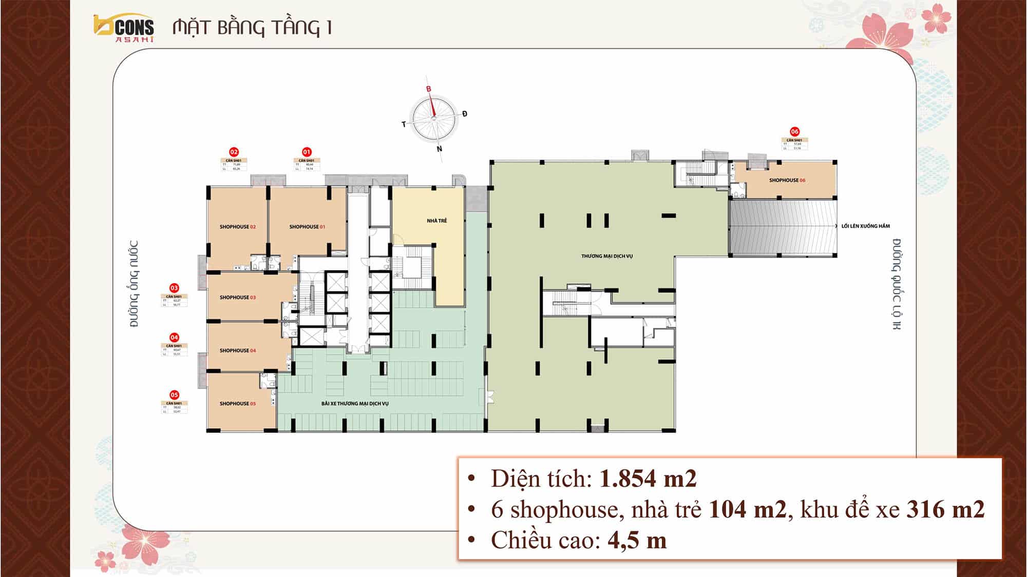 Mặt bằng tổng thể của dự án Bcons Asahi được xây dựng trên quỹ đất khoảng 3.233 m², trong đó mật độ xây dựng dao động khoảng 39–40%. Dự án bao gồm: