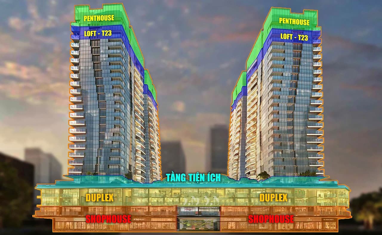 - Tầng 1-2: Shophouse và sảnh đón khách.