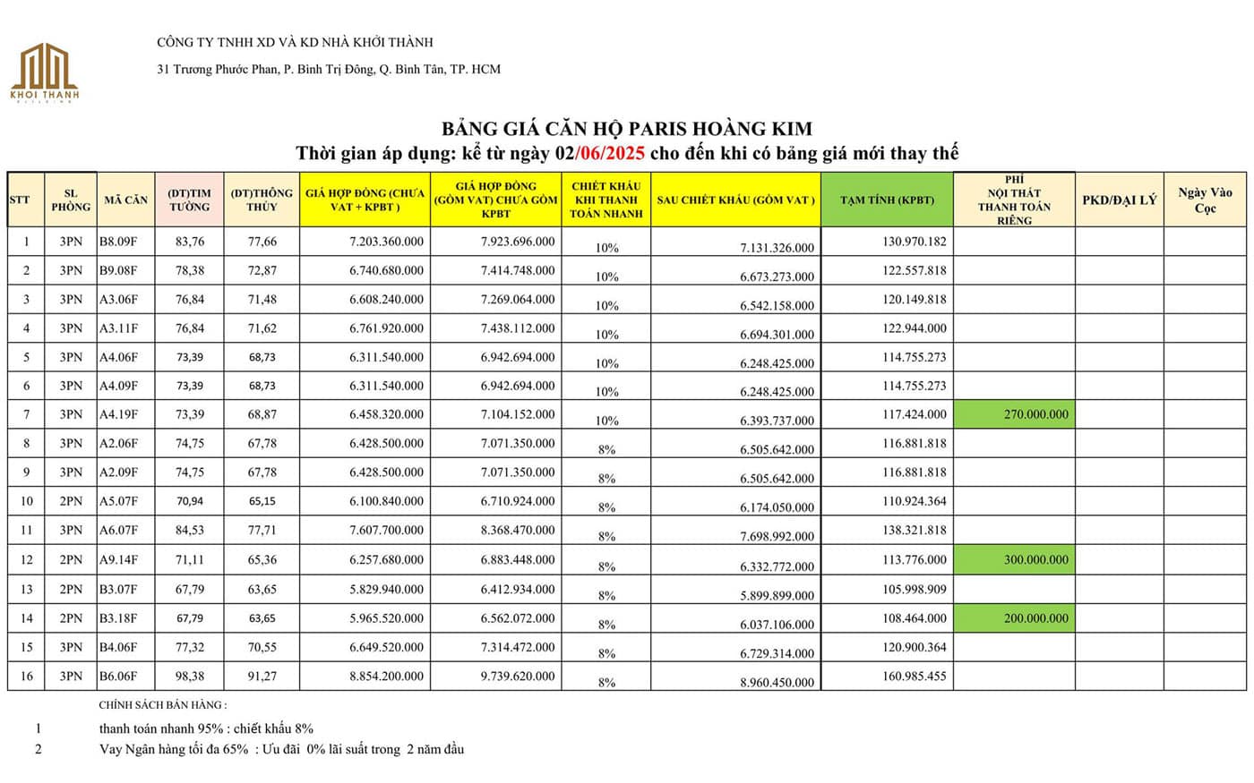 Các căn hộ Paris Hoàng Kim có diện tích linh hoạt từ 57 – 169 m², mức giá hiện tại dao động khoảng 85 – 100 triệu đồng/m². Với vị trí trung tâm, tiện ích đầy đủ và thiết kế mang dấu ấn khác biệt, mức giá này được xem là cạnh tranh so với mặt bằng giá các dự án cùng phân khúc tại khu vực Thủ Thiêm. Đây cũng là lý do dự án được nhiều nhà đầu tư đánh giá cao về khả năng sinh lời lâu dài.