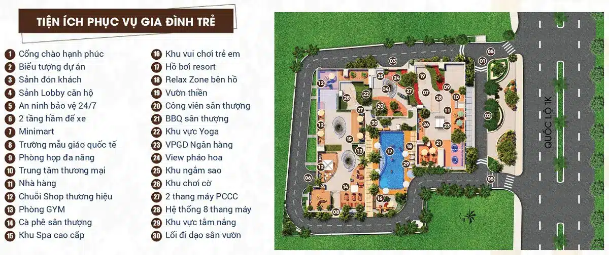 - Khu vui chơi trẻ em, đường dạo bộ, phòng sinh hoạt cộng đồng.