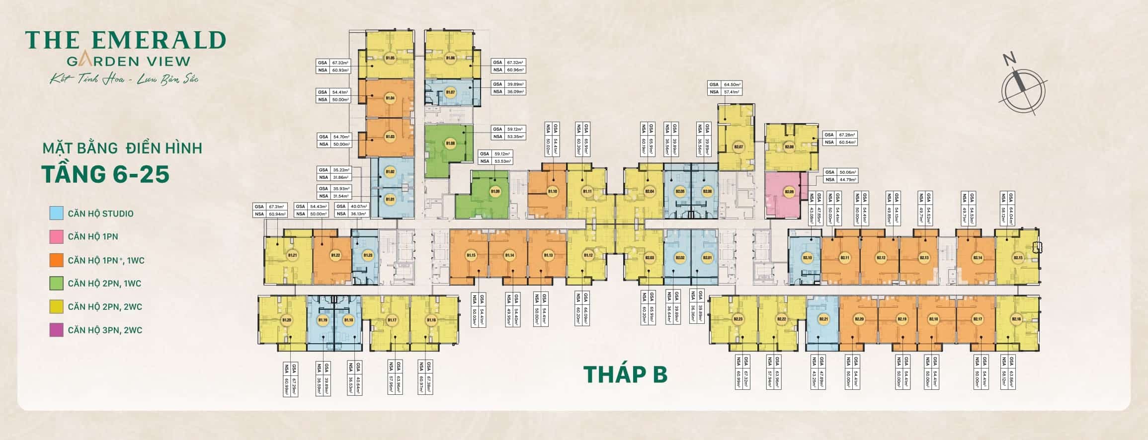 The Emerald Garden View được quy hoạch với 2 block căn hộ, cung cấp ra thị trường khoảng 2.000 sản phẩm, đáp ứng đa dạng nhu cầu an cư và đầu tư. Cơ cấu căn hộ phong phú giúp dự án phù hợp cho nhiều nhóm khách hàng, từ người độc thân, gia đình trẻ đến nhà đầu tư khai thác thương mại.