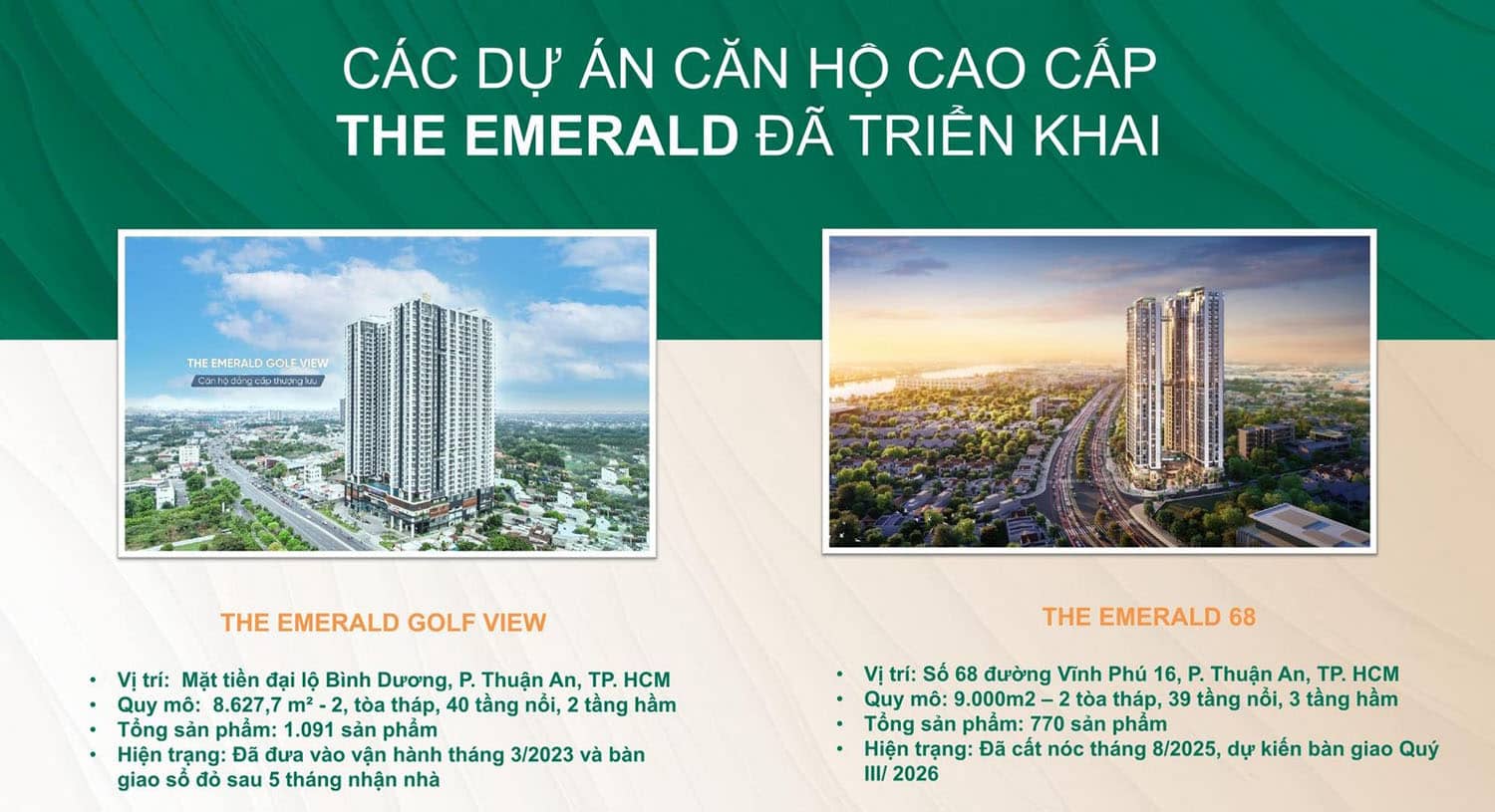 - The Emerald 68 – Dự án cao cấp tại trung tâm Thuận An, nổi bật với thiết kế hiện đại, không gian sống tối ưu.