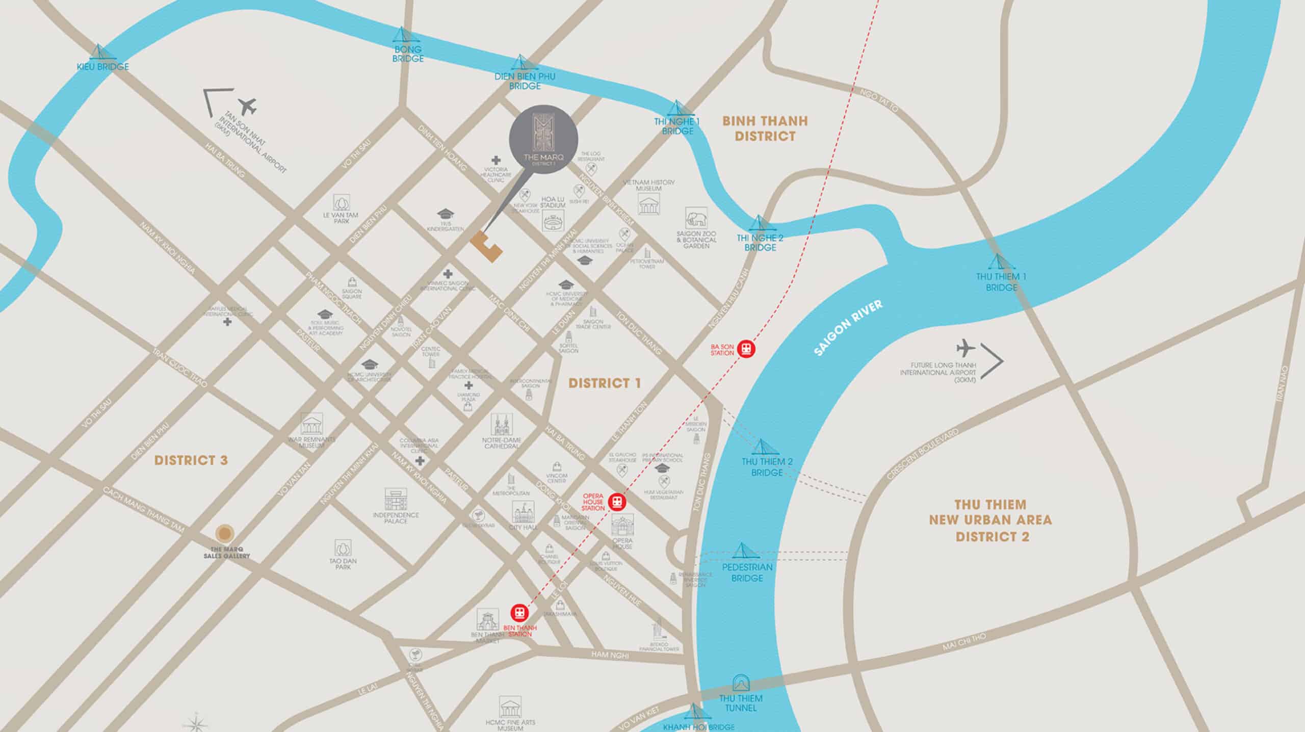 Từ The Marq, cư dân chỉ mất 5 – 10 phút để di chuyển đến các địa điểm nổi tiếng như Nhà thờ Đức Bà, Dinh Độc Lập, Chợ Bến Thành, Phố đi bộ Nguyễn Huệ. Đồng thời, đây cũng là nơi tập trung hàng loạt trung tâm thương mại lớn như Vincom Center, Diamond Plaza, Takashimaya – Saigon Center. Ngoài ra, cư dân còn dễ dàng tiếp cận các công viên xanh như Lê Văn Tám, 23/9, 30/4, cũng như các bệnh viện quốc tế và phòng khám uy tín.